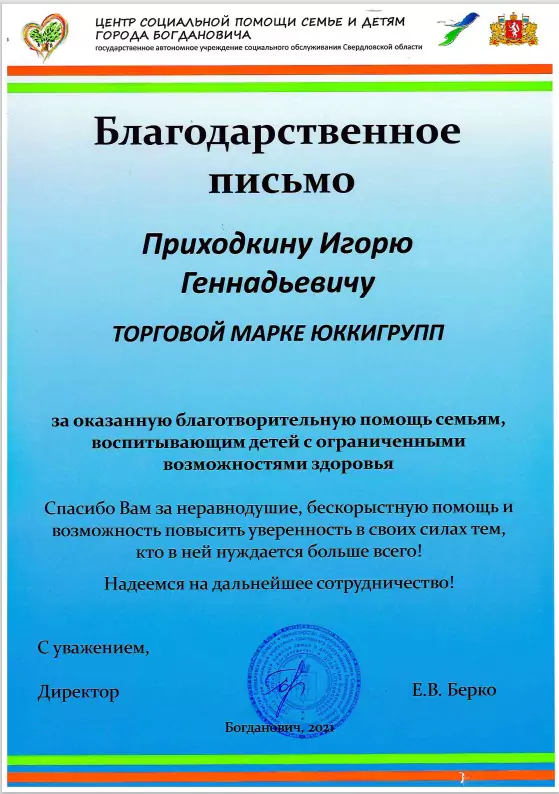 Компания "ЮкиГрупп" получила благодарственное письмо из "Центра социальной помощи семье и детям" г. Богдановича за оказанную благотворительную помощь семьям, воспитывающим детей с ограниченными возможностями.